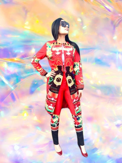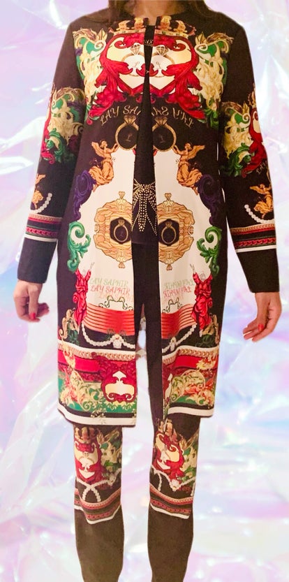Composé d’une veste longue à imprimé exclusif et d’un pantalon taille haute, ce look incarne l’élégance sobre et moderne.