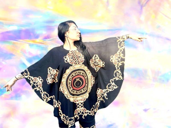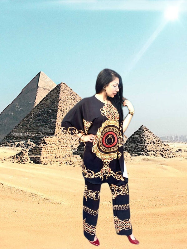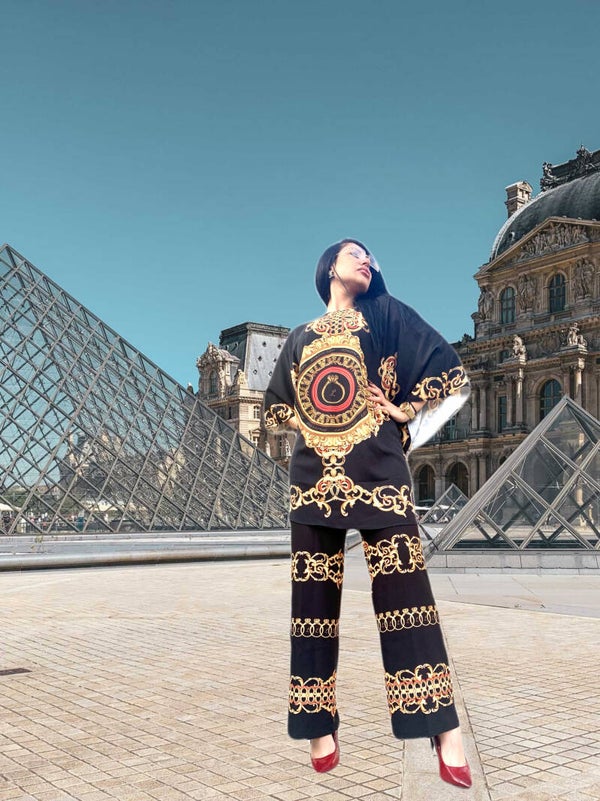 Confectionné dans un noir intense, illuminé par des détails dorés raffinés et des strass glamour, cet ensemble incarne l’ADN de Lay Saphir : l’élégance intemporelle, la liberté de mouvement, et la féminité affirmée.