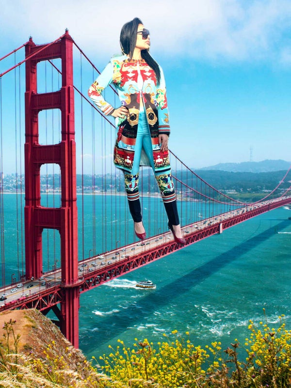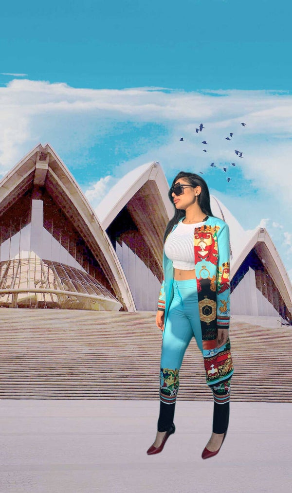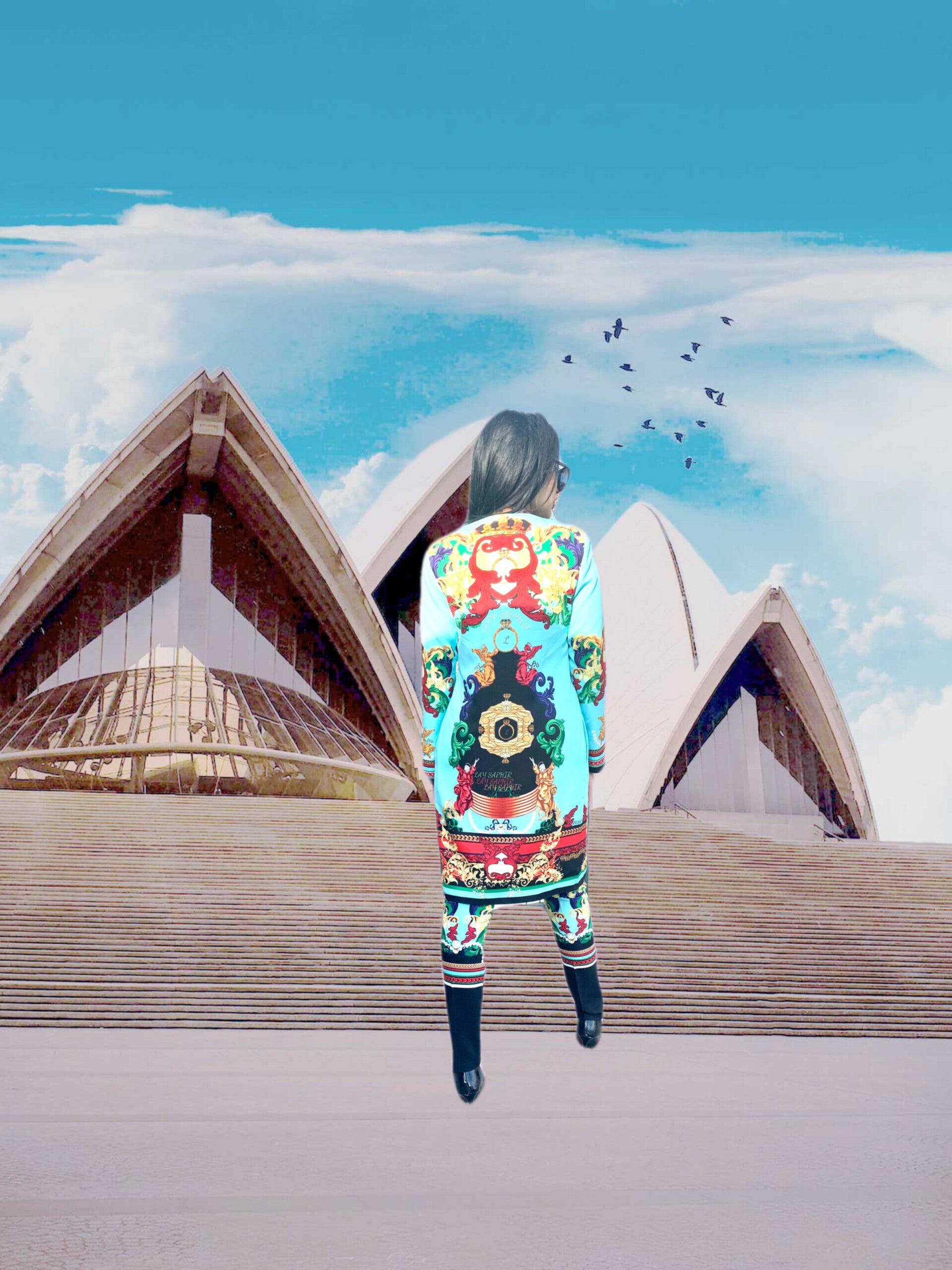 Composé d’une veste longue à imprimé exclusif et d’un pantalon taille haute, ce look incarne l’élégance sobre et moderne.