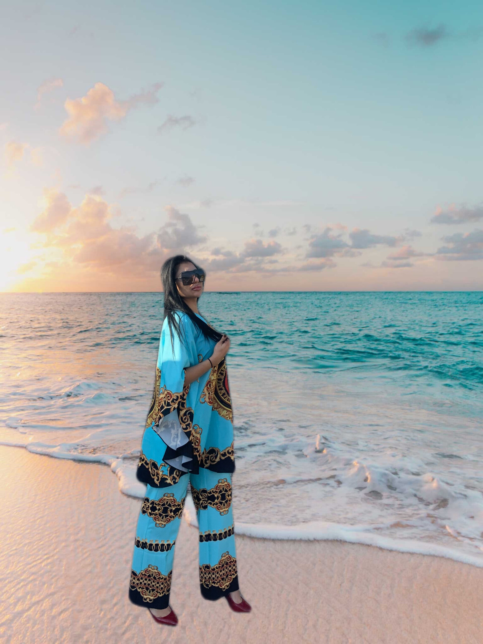 Conçu dans un bleu ciel lumineux, orné de détails dorés raffinés et de strass discrets, il incarne l’esprit Lay Saphir : une féminité libre et assumée, une silhouette mise en valeur, et une coupe qui laisse respirer le corps.