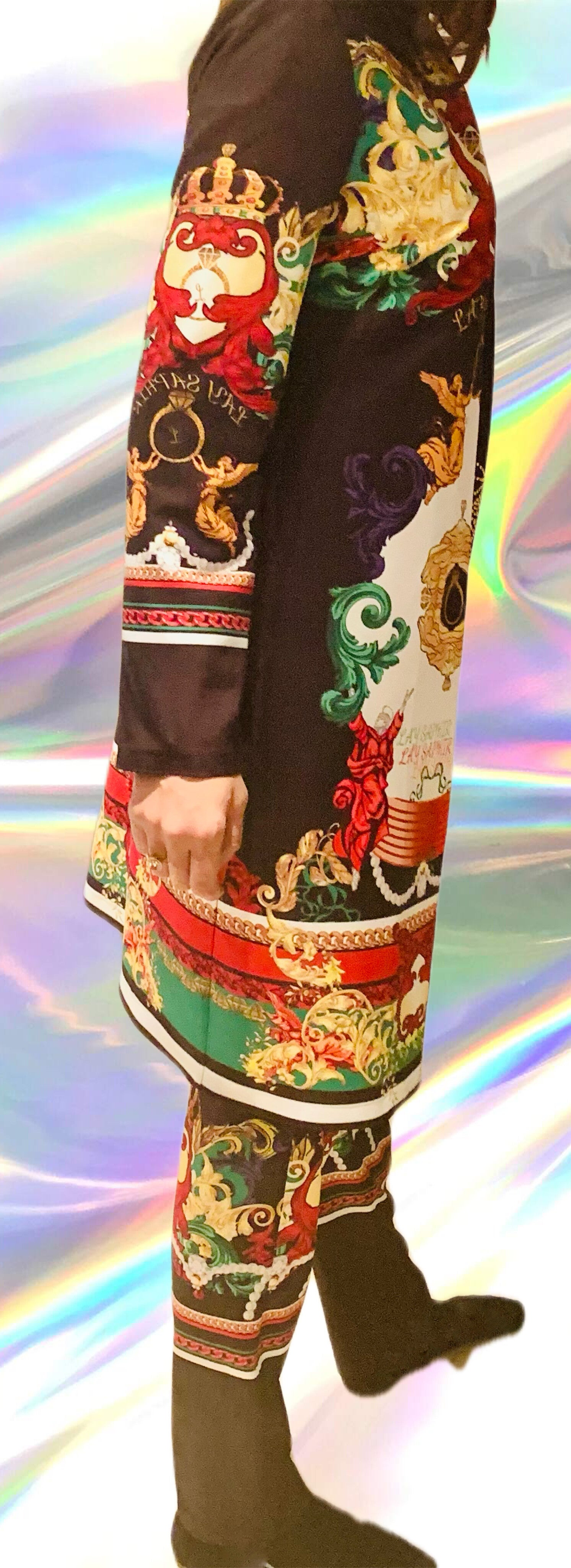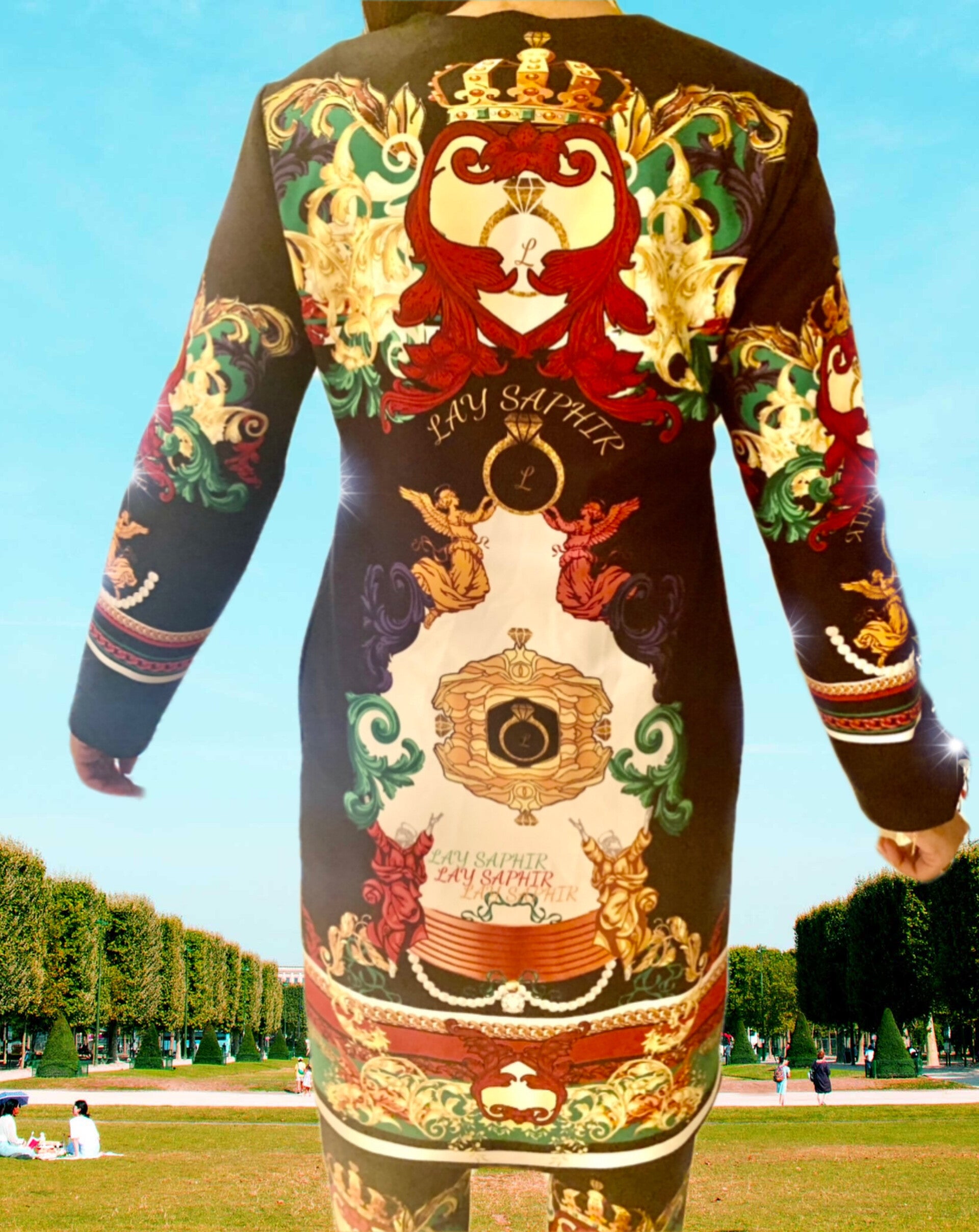 Composé d’une veste longue à imprimé exclusif et d’un pantalon taille haute, ce look incarne l’élégance sobre et moderne.